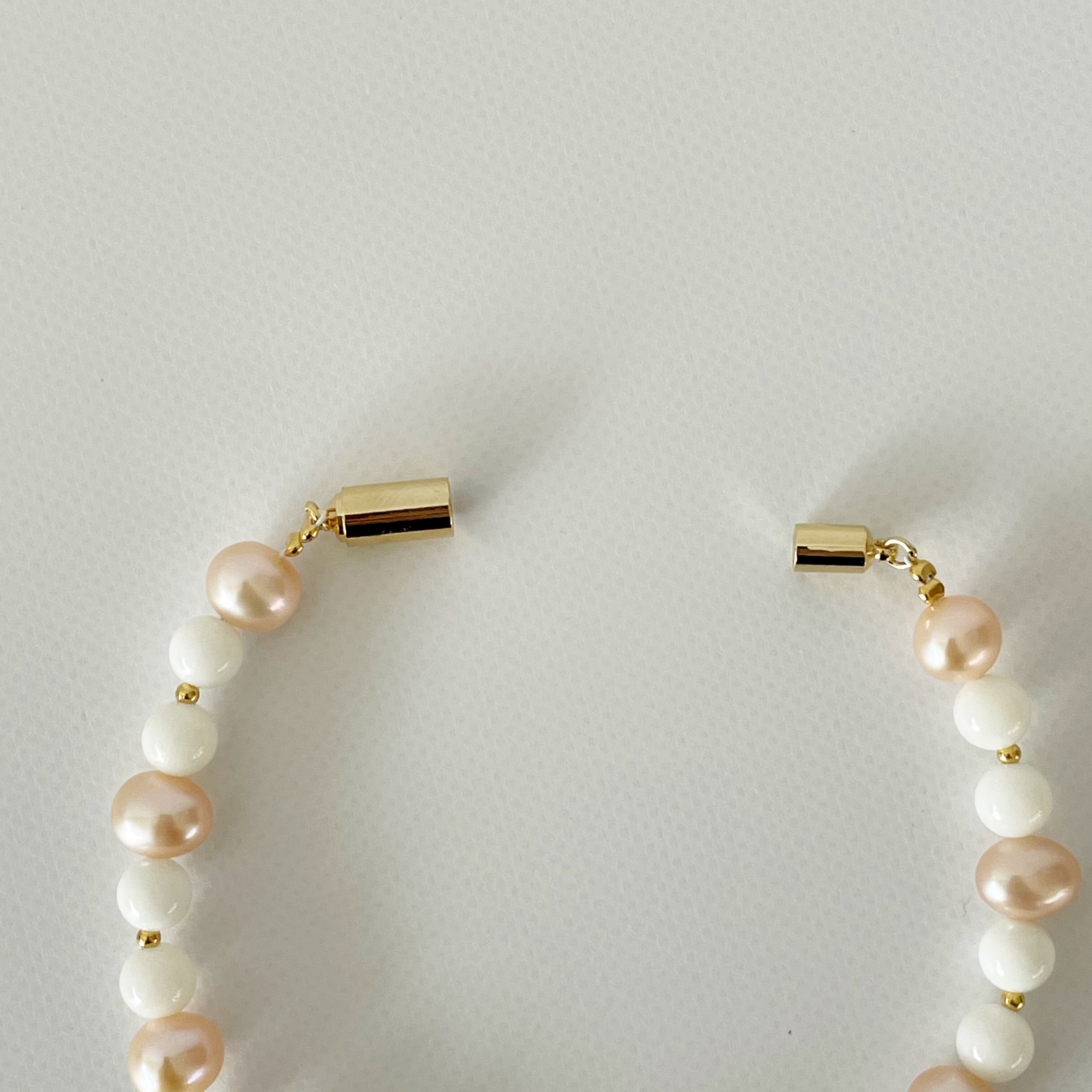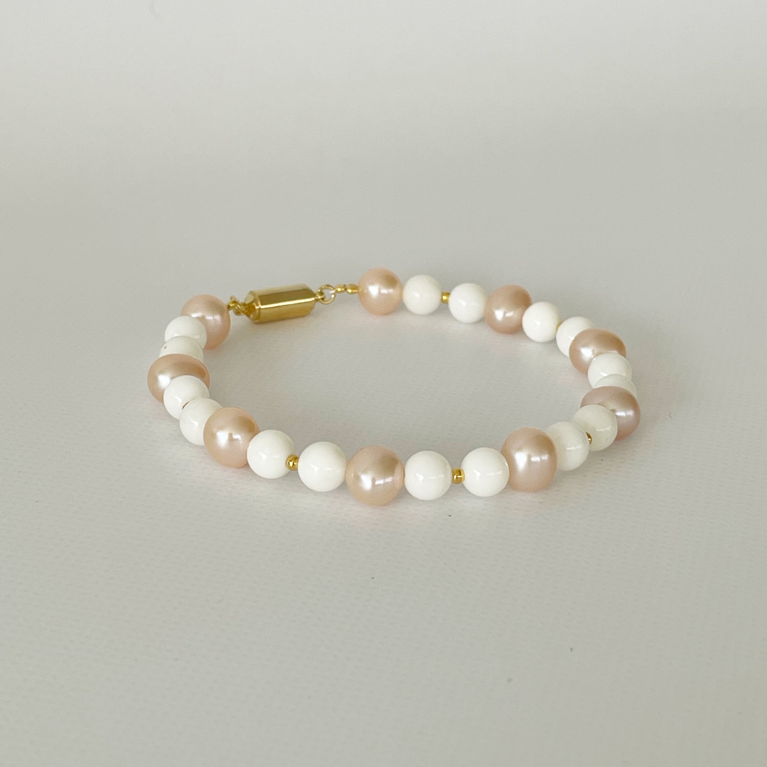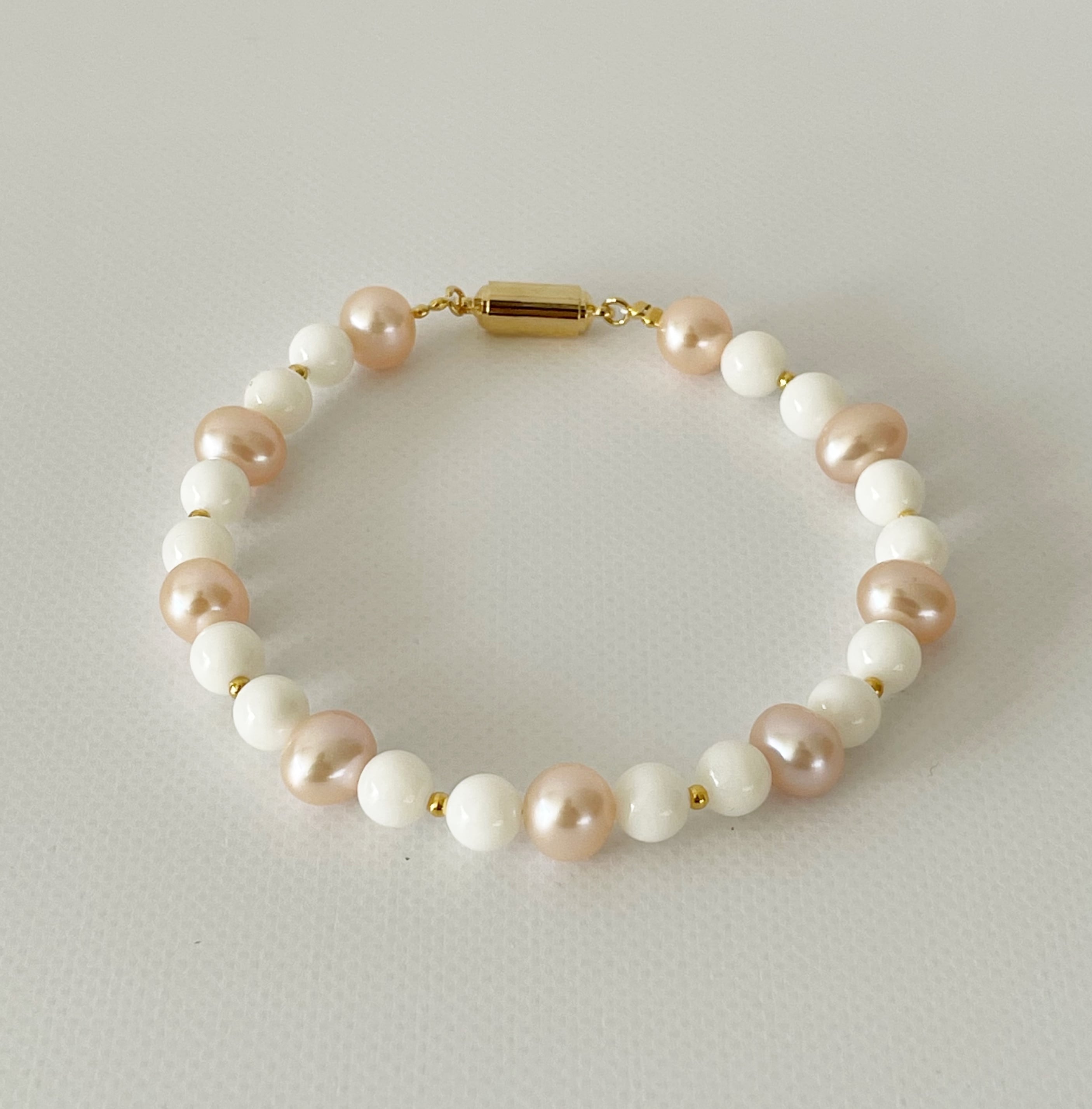 白珊瑚と優しいフォルムの淡水パールを組み合わせたブレスレットです。