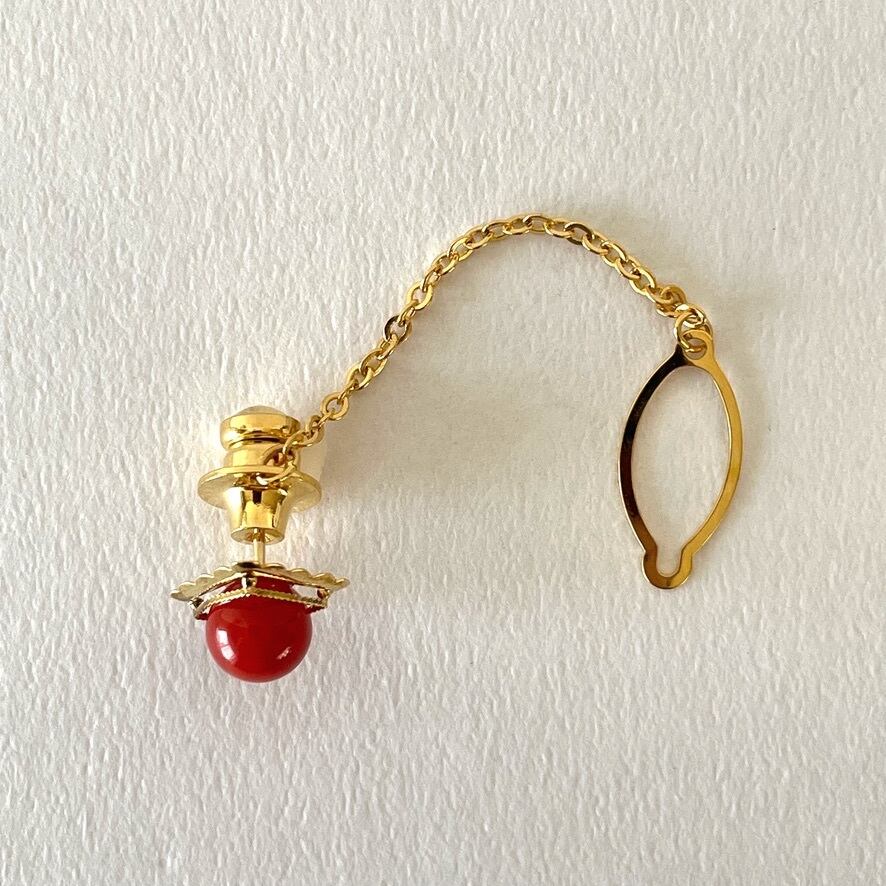 K18ゴールドと赤珊瑚を使用した、エレガントなボタンチェーン付きのピンタックです。赤珊瑚の深い色合いと美しさは、シンプルながらも高級感のあるデザインを引き立てています。
