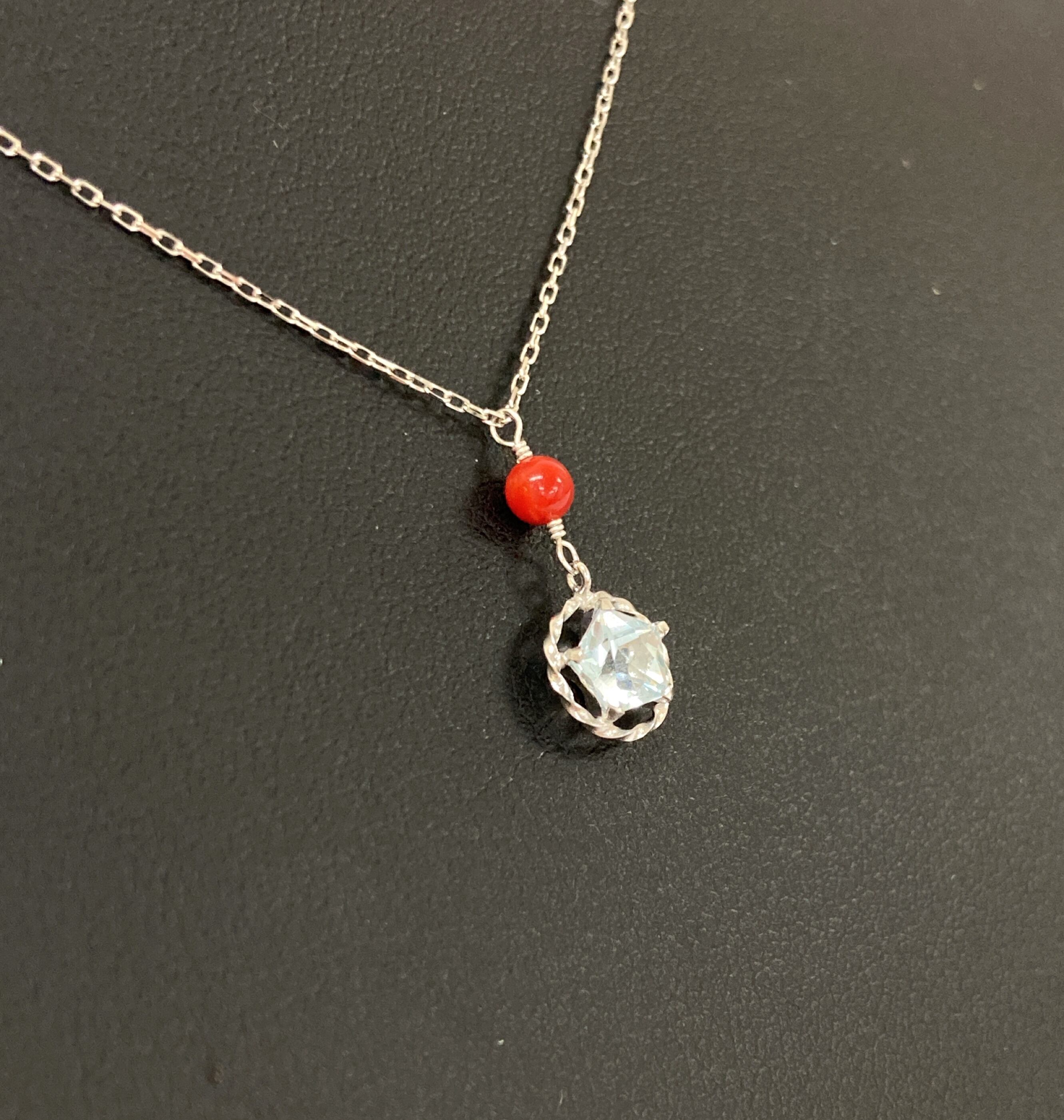 繊細で華奢なPtのスライドボールチェーンに、赤い宝石珊瑚と5角形にカットされたトパーズはまるで星のような輝きを放っています。