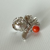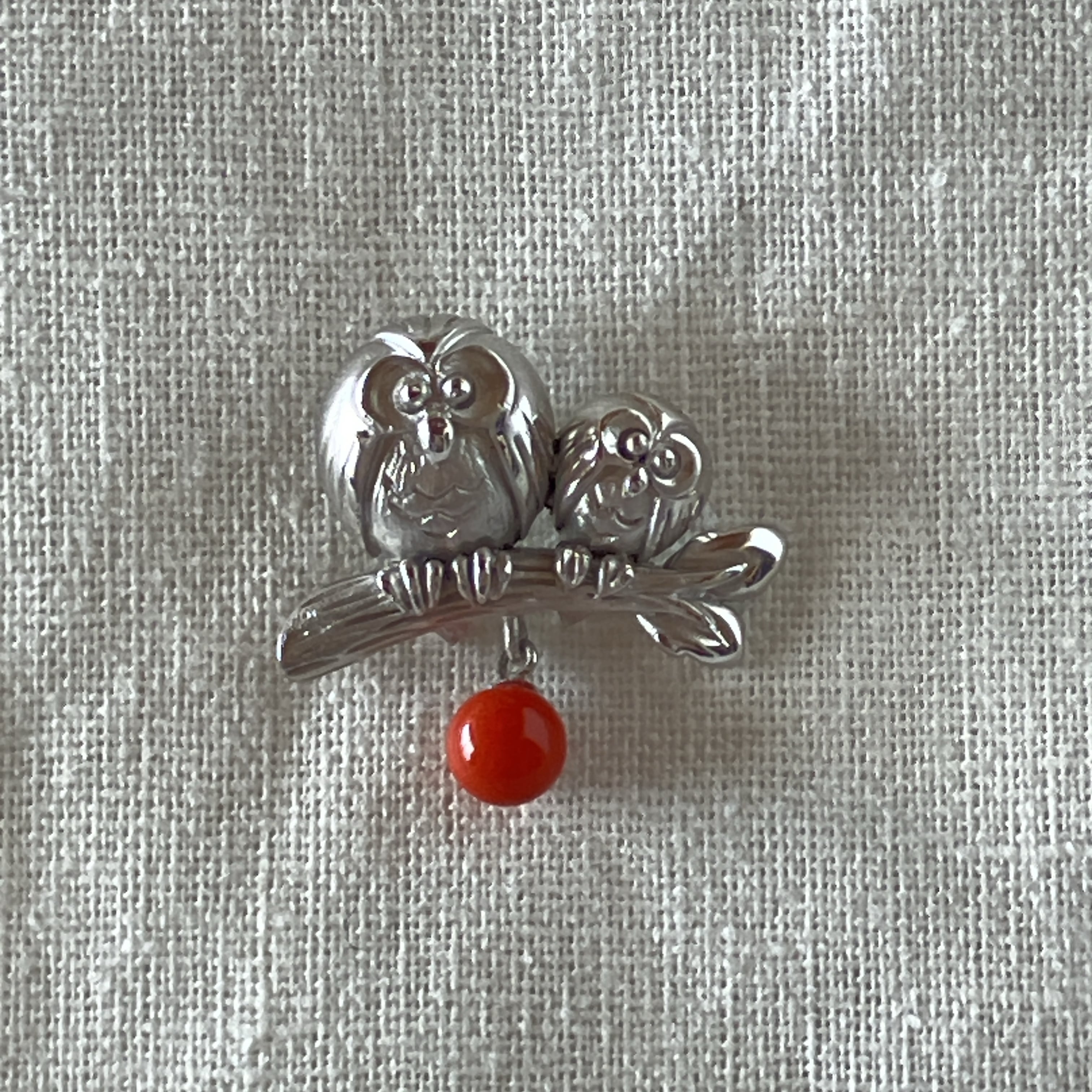 親子フクロウのモチーフに地中海珊瑚をセッティングしたピンタックブローチです。