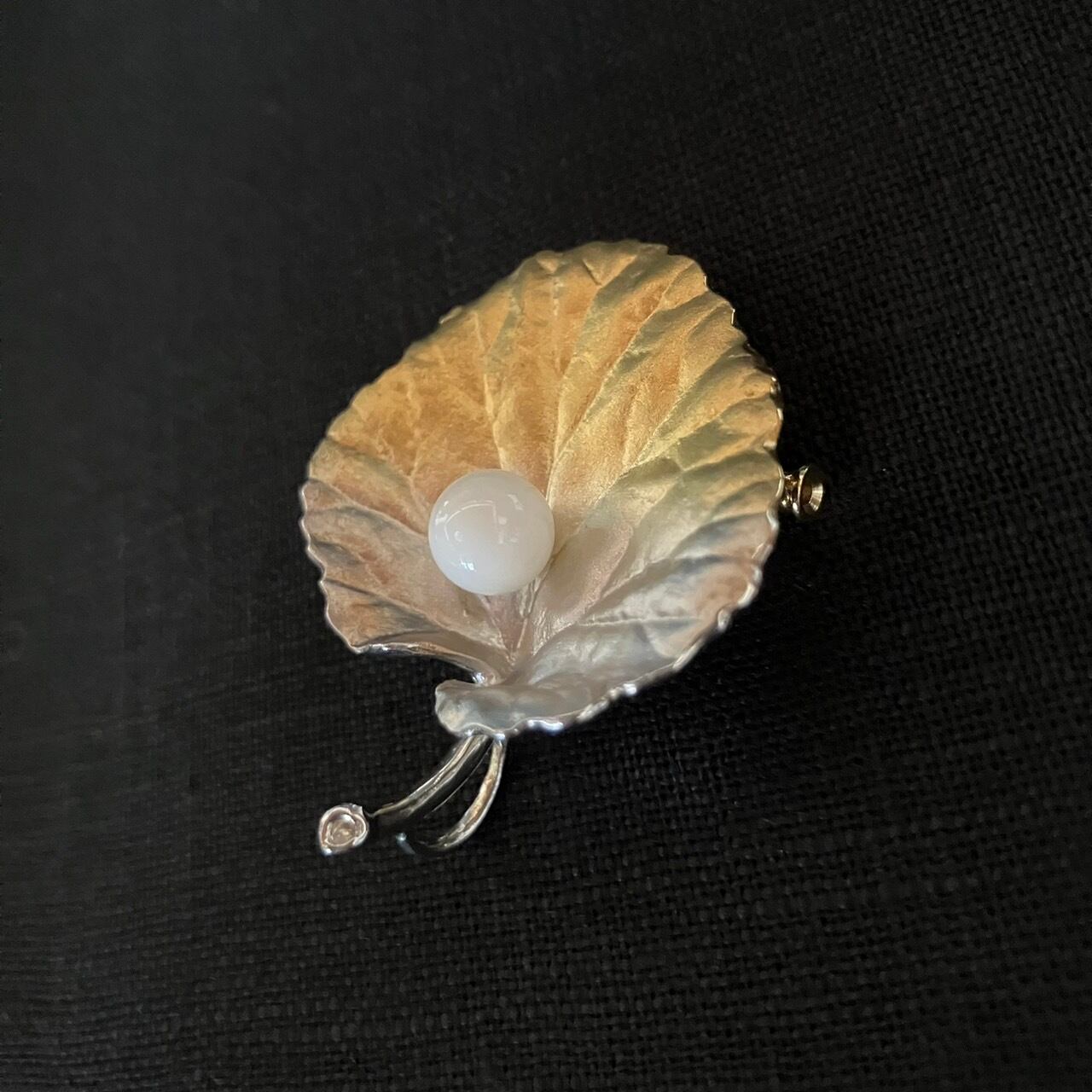 ゴールドとシルバーのコントラストが美しいブローチです。背面にある金具にチェーンや、パールを通せばペンダントトップとしてもご利用いただけます。