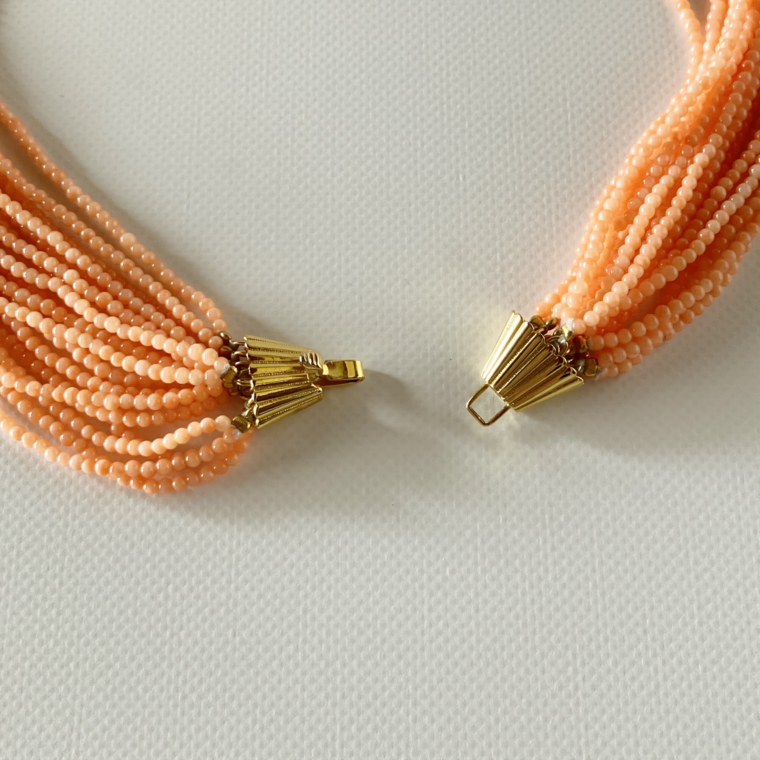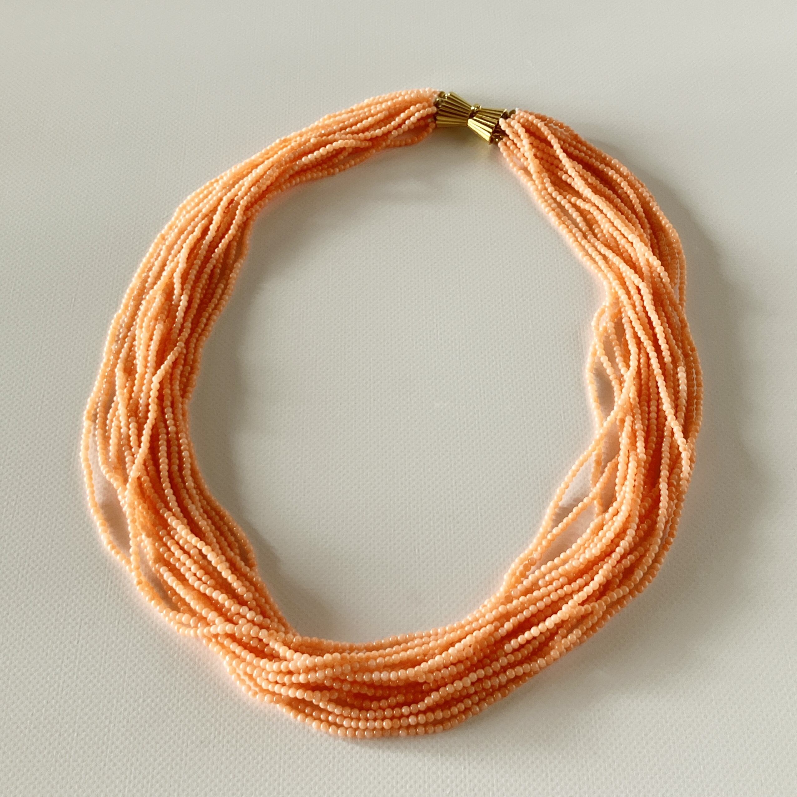 一つひとつ専門の職人が丁寧に繋いでいるピンク珊瑚の18連ネックレス。