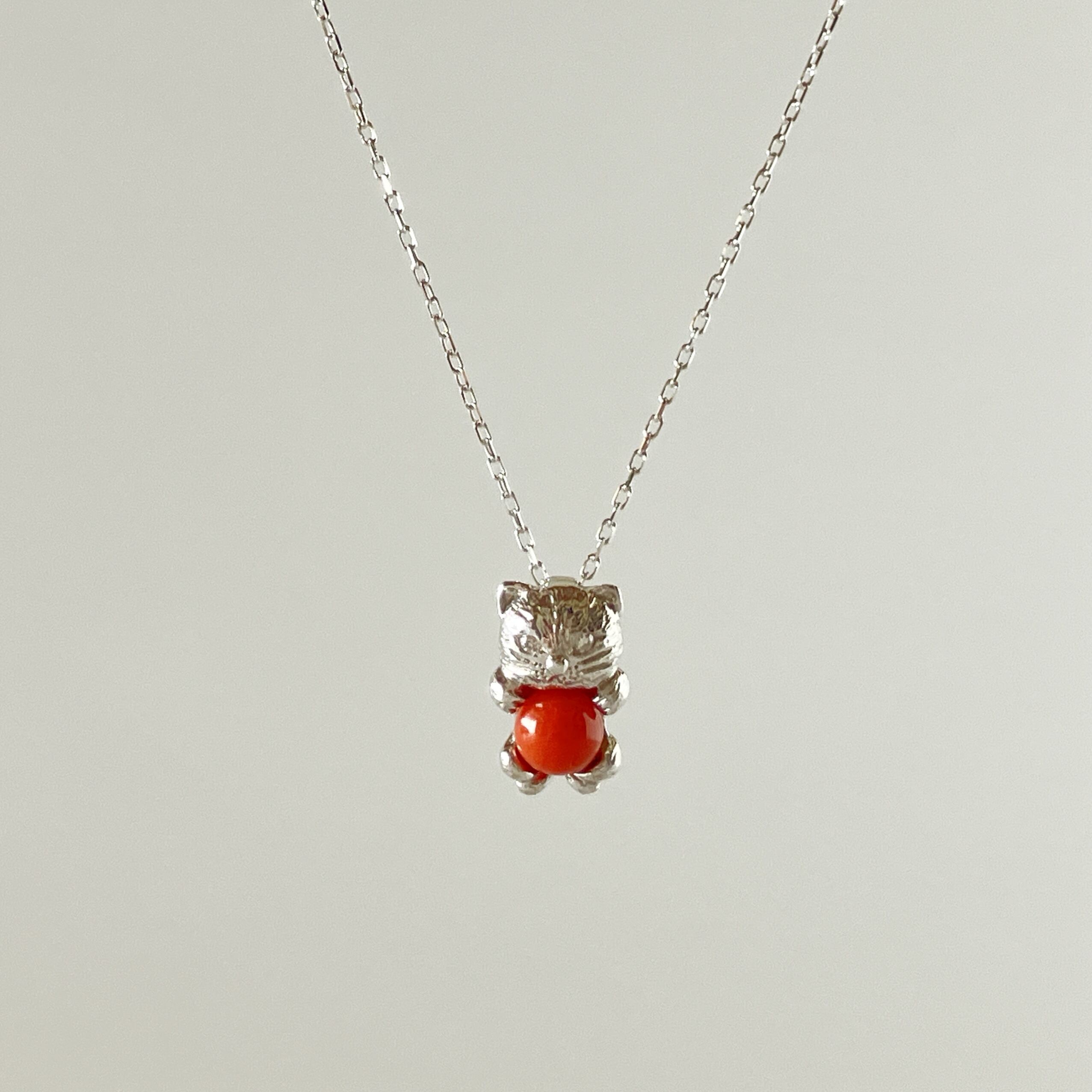 猫のチャームに赤珊瑚とダイヤモンドをセッティングした可愛いペンダントです。
