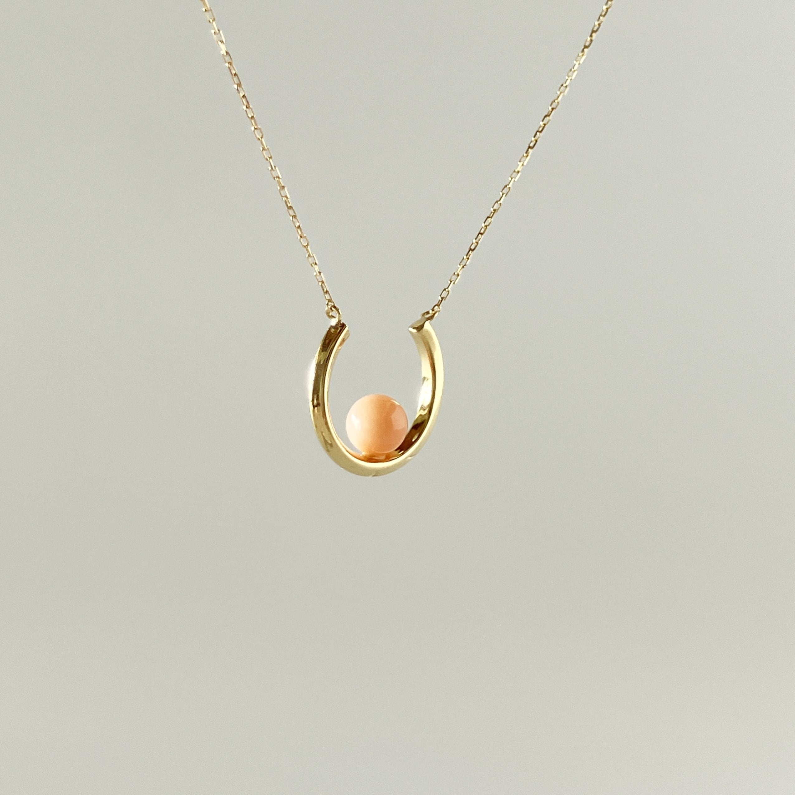 U字の馬蹄モチーフにぴんく珊瑚をセッティングしたペンダント。