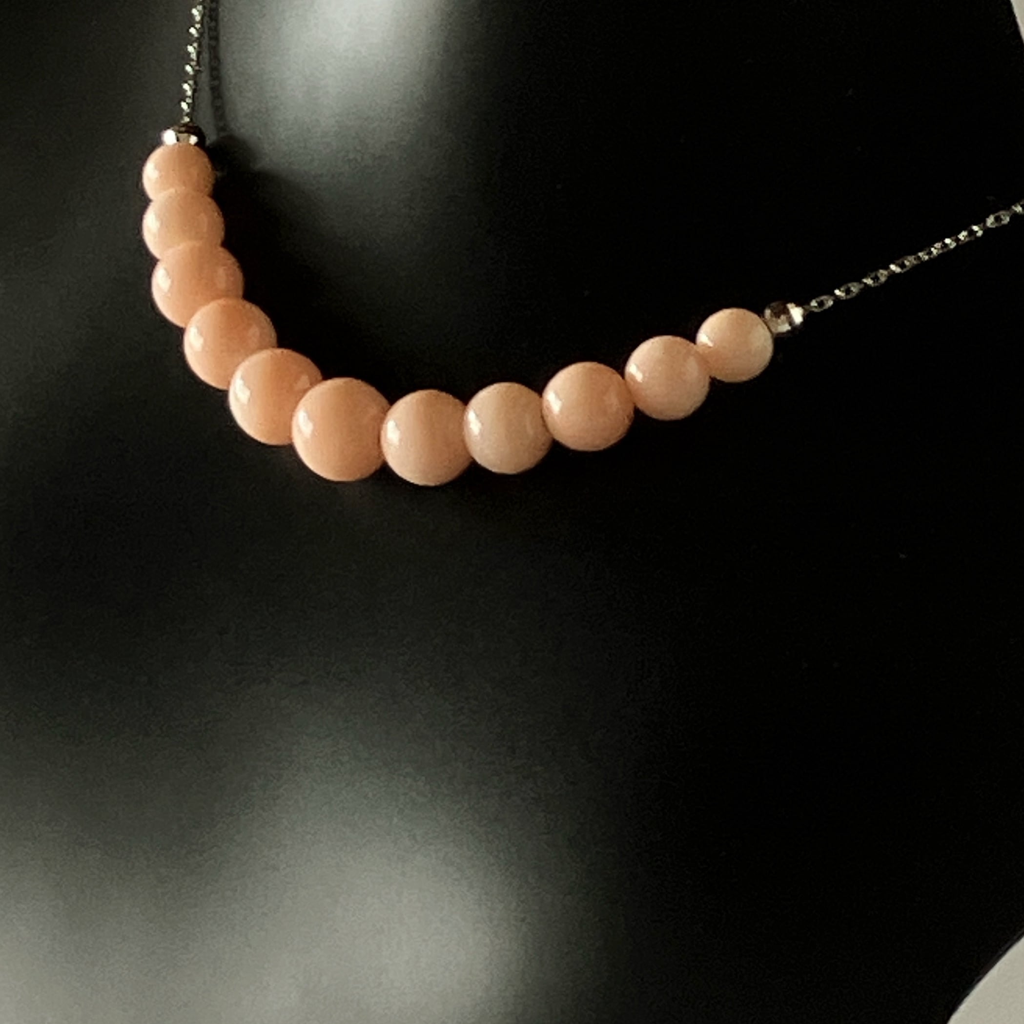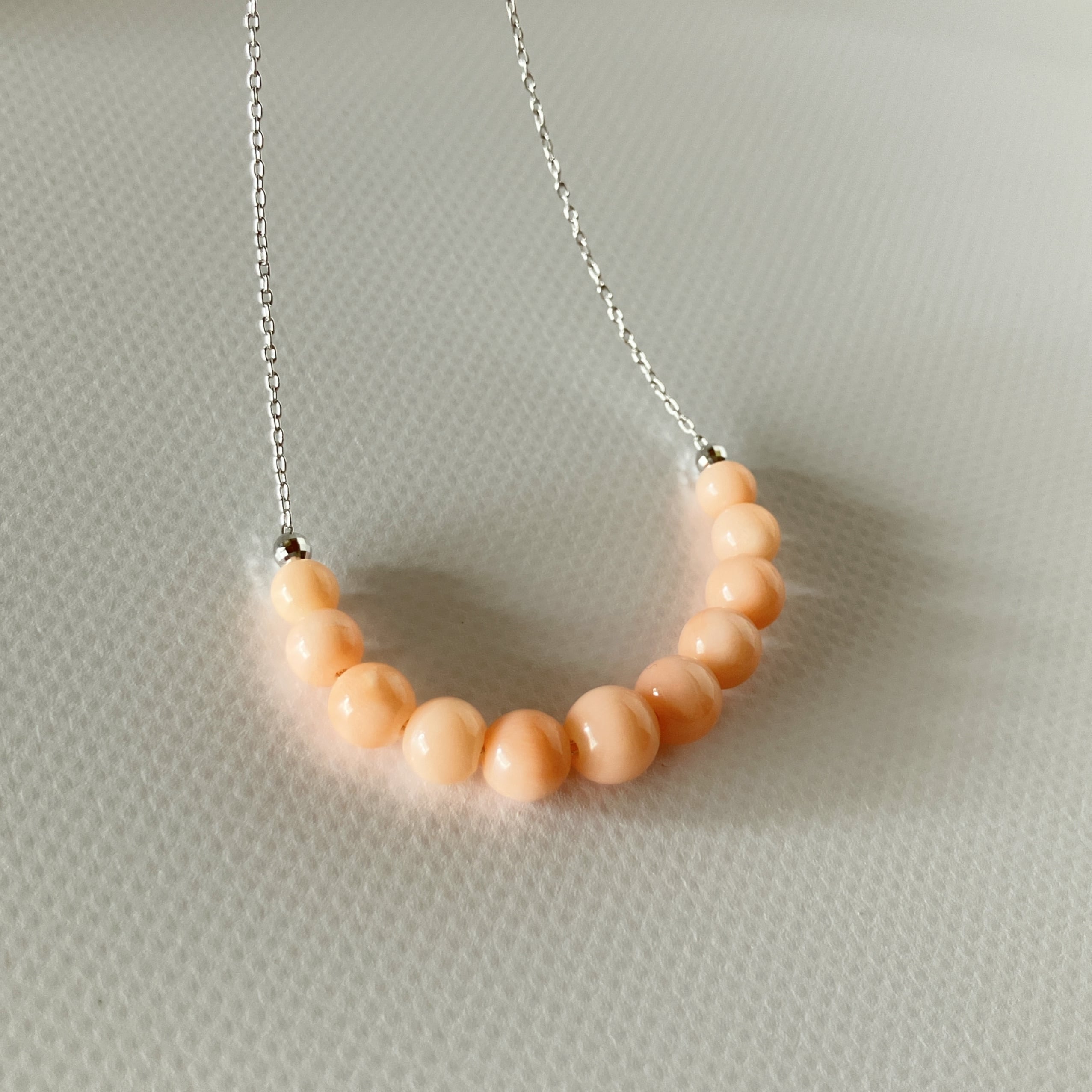 上質なホワイトゴールドのチェーンに、柔らかなぴんく珊瑚をセッティングしたデザイン。
