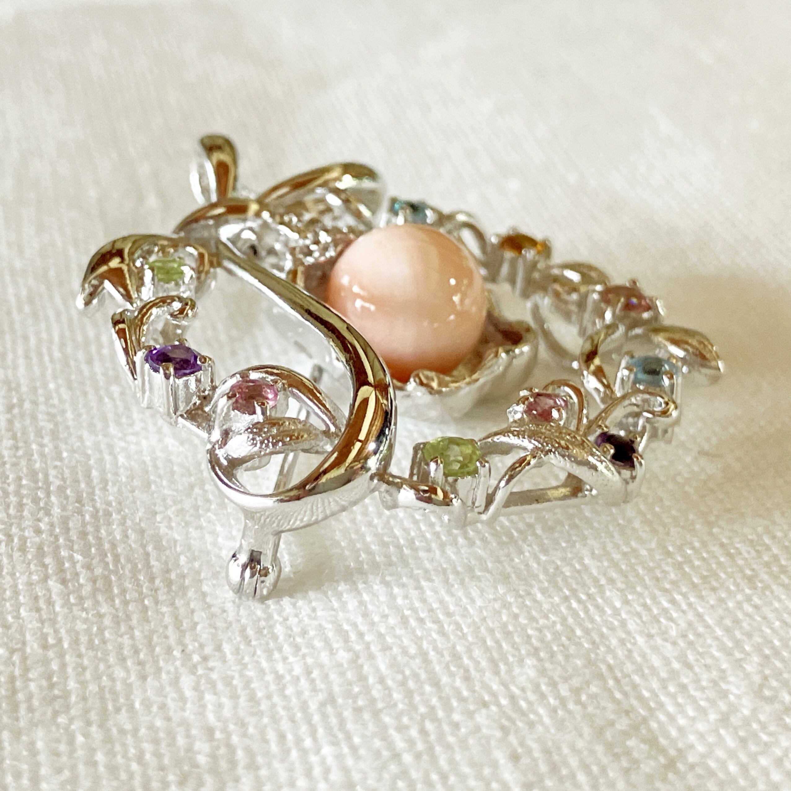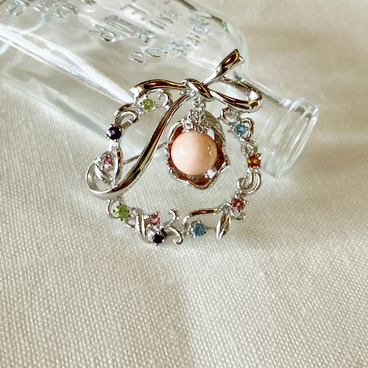 大玉ぴんく珊瑚 ジルコニア ブローチ SV