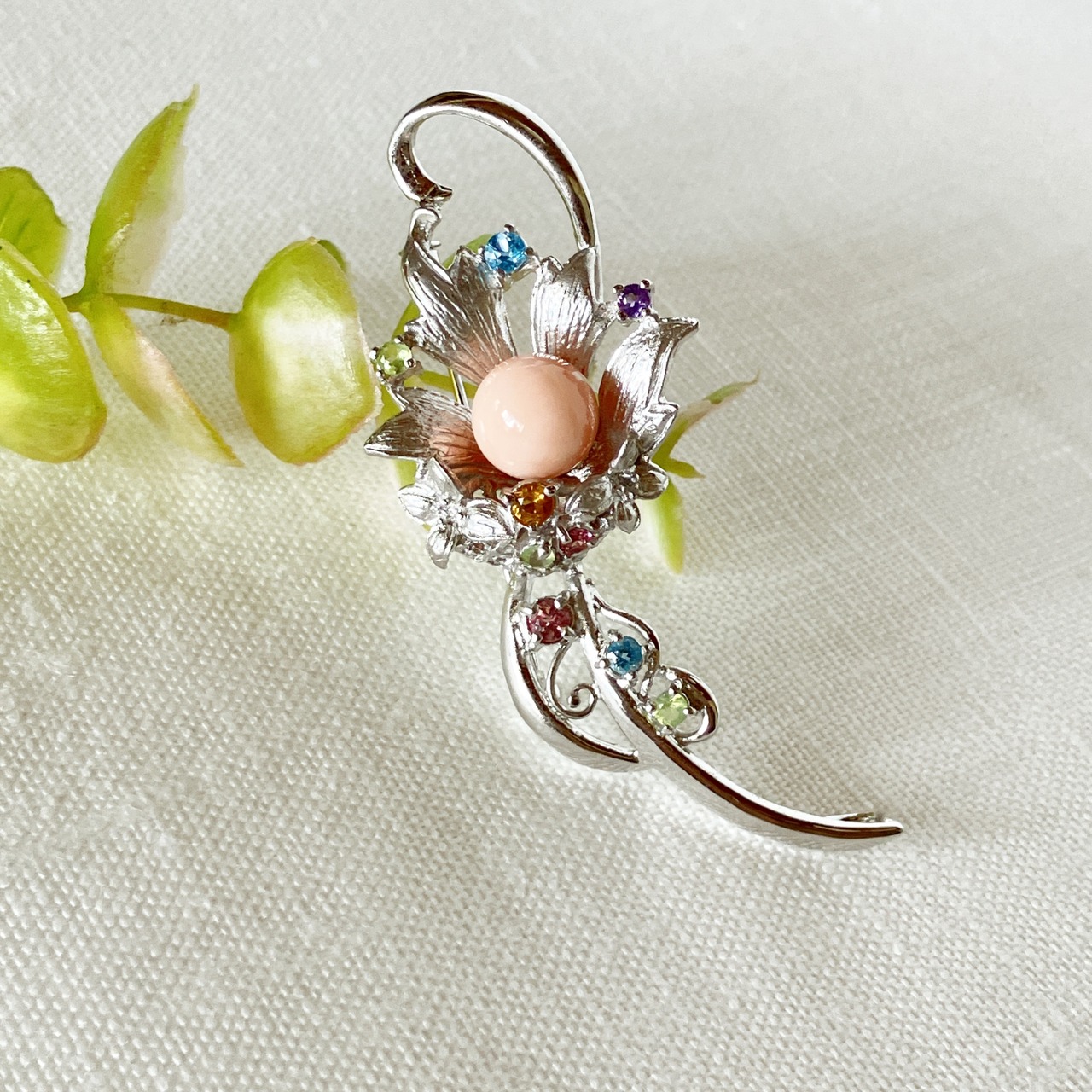 ぴんく珊瑚 ジルコニア フラワーブローチ SV fb-23
